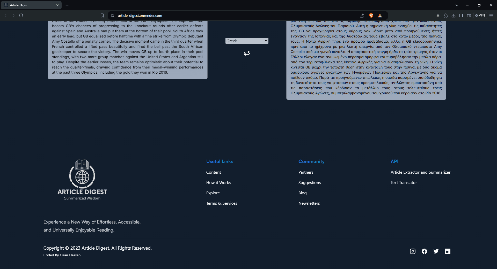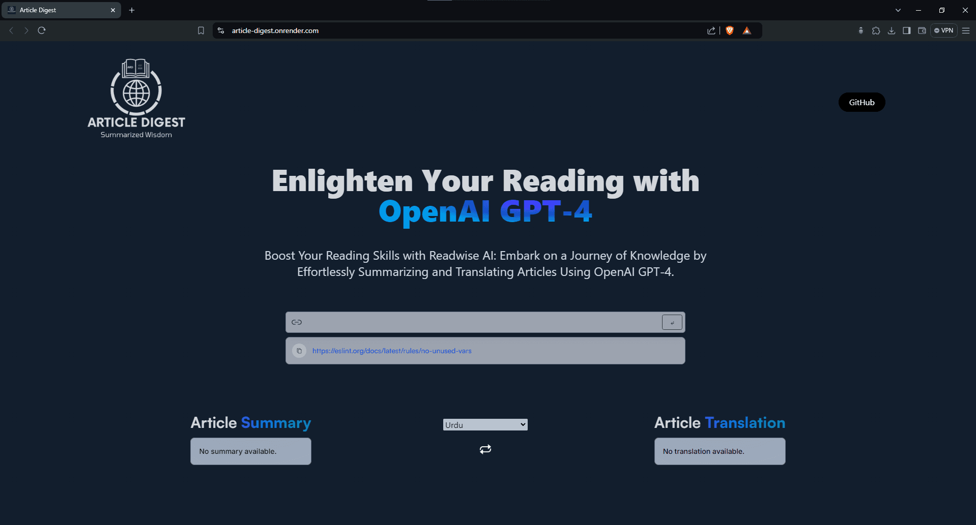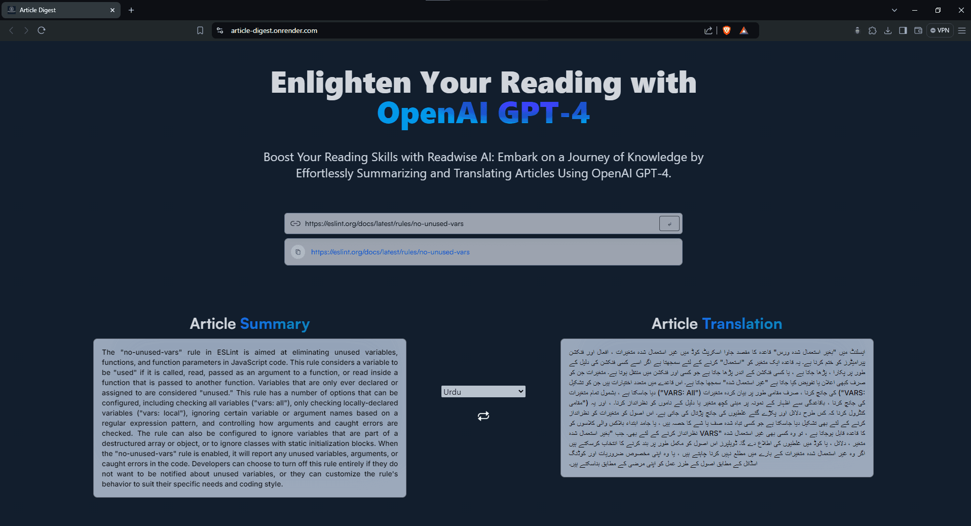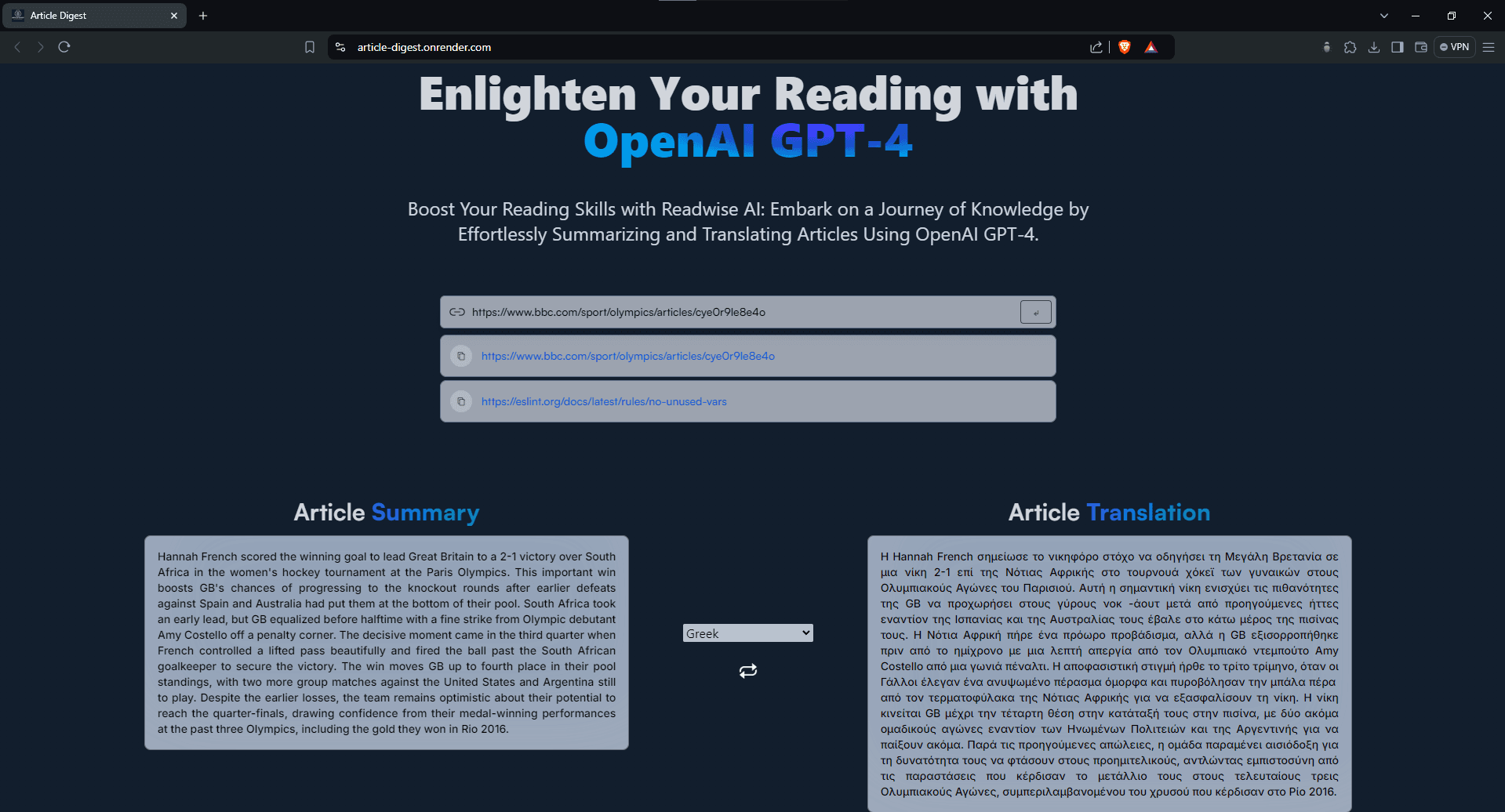 Web application harnessing the power of the GPT-4 API for generating article summaries and Rapid API for translations.