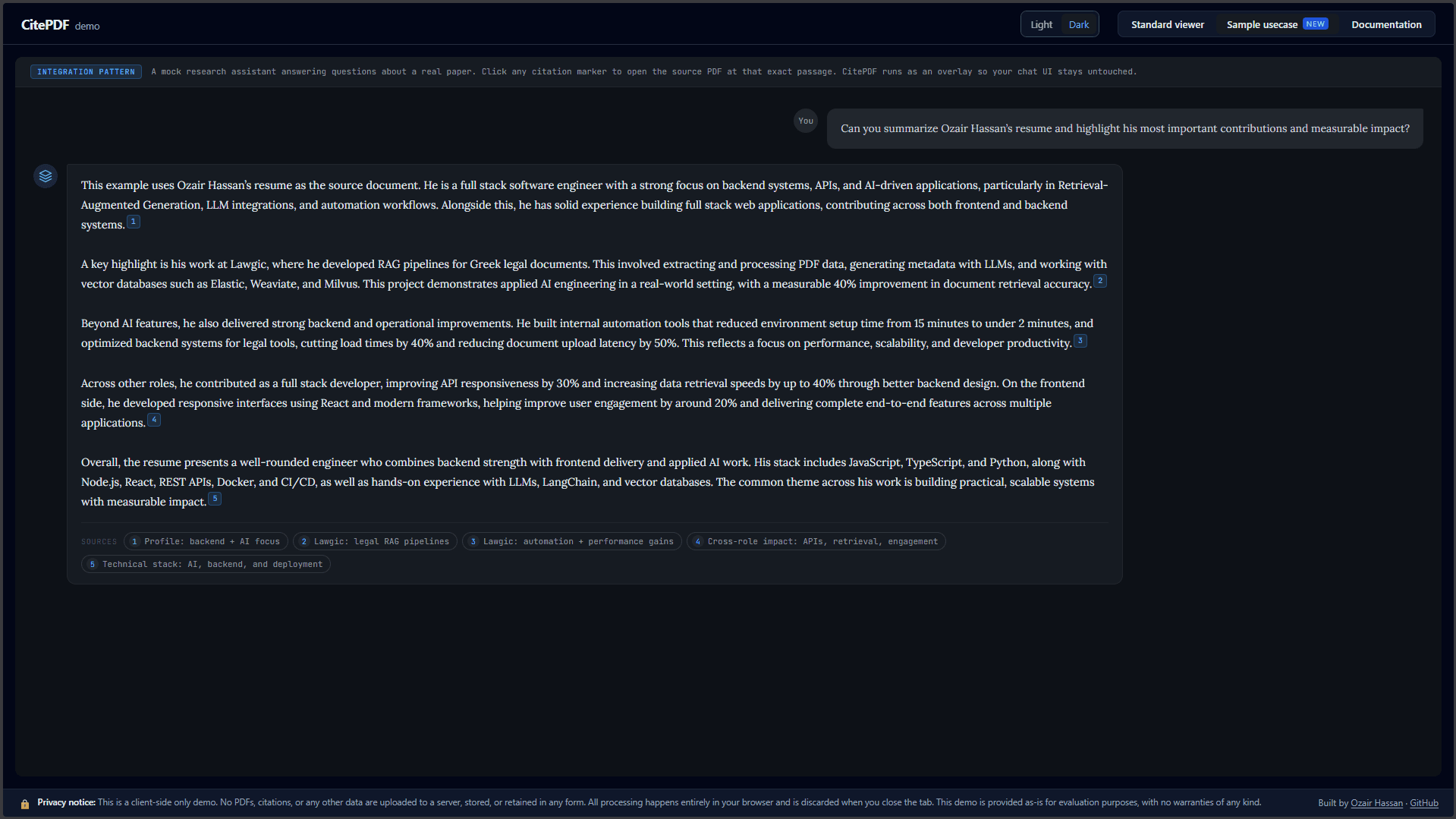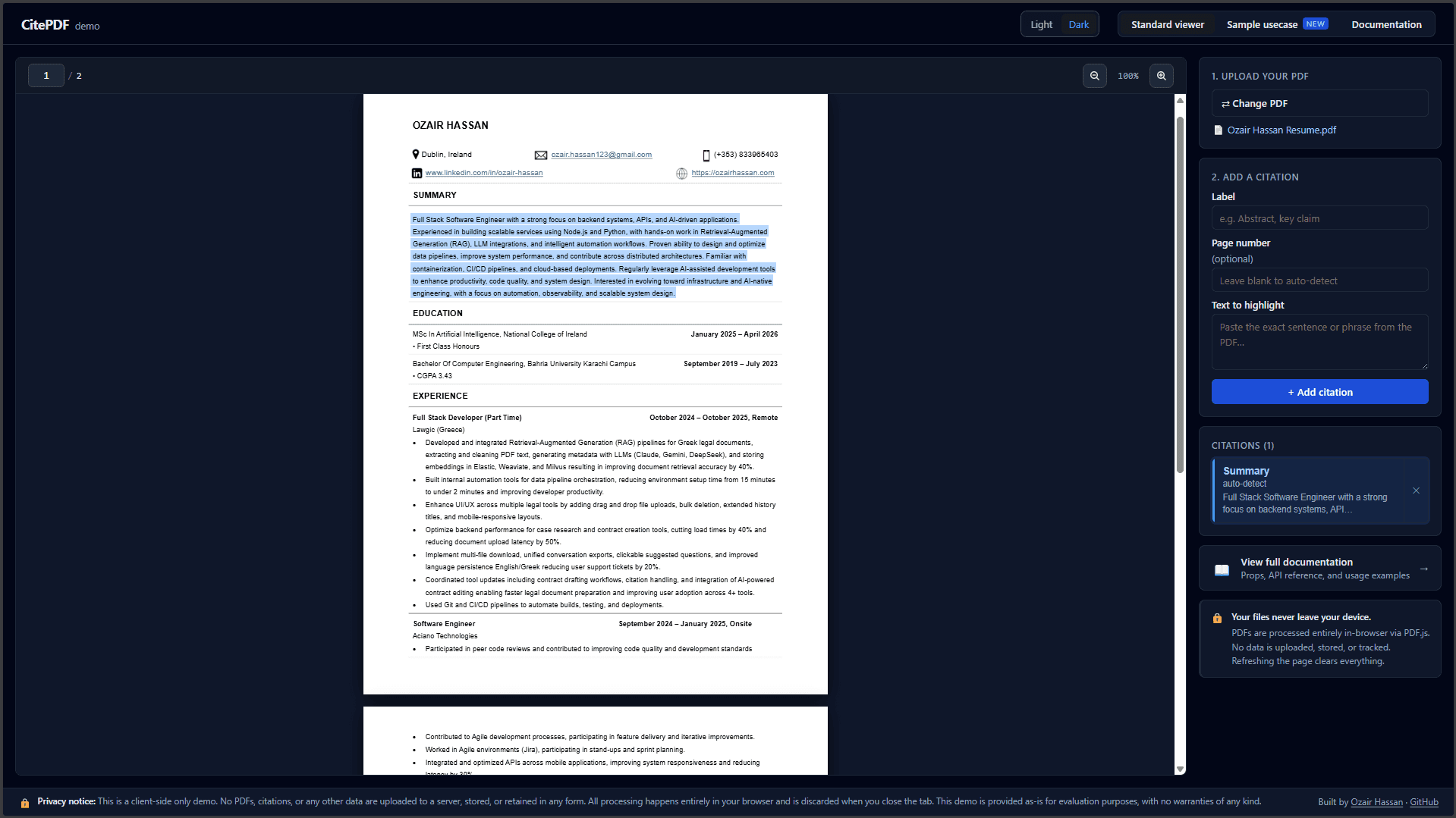 Reading PDFs in a browser is easy enough. Actually linking your UI to specific passages inside them is a very different problem. I ran into this while working at Lawgic, where we needed to add citations to legal documents. We could generate and display the citations themselves, but highlighting the exact text in the PDF and scrolling to it reliably was a different story. We looked around for existing solutions, but nothing really did what we needed, so we ended up compromising at the time.... Read more