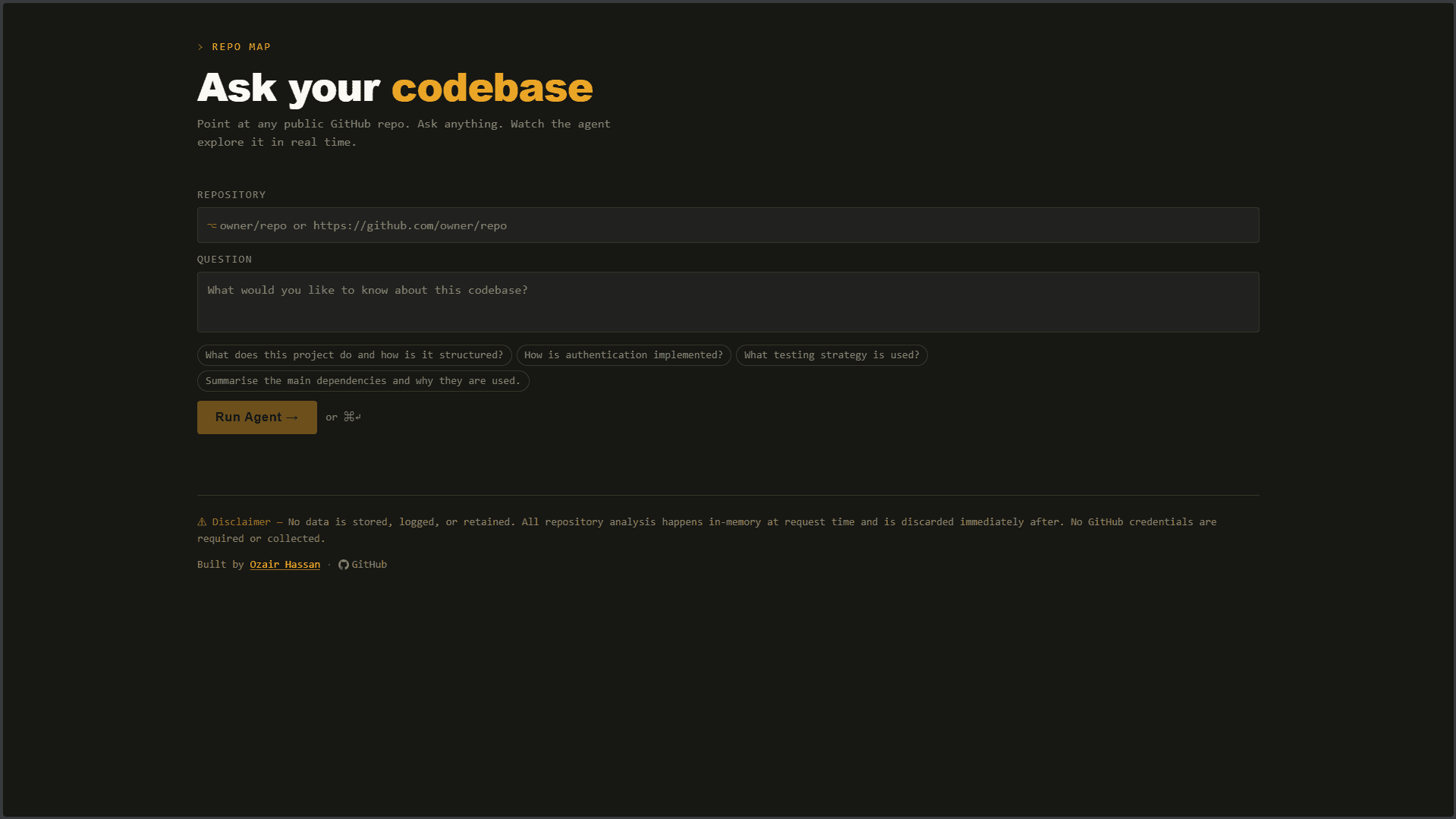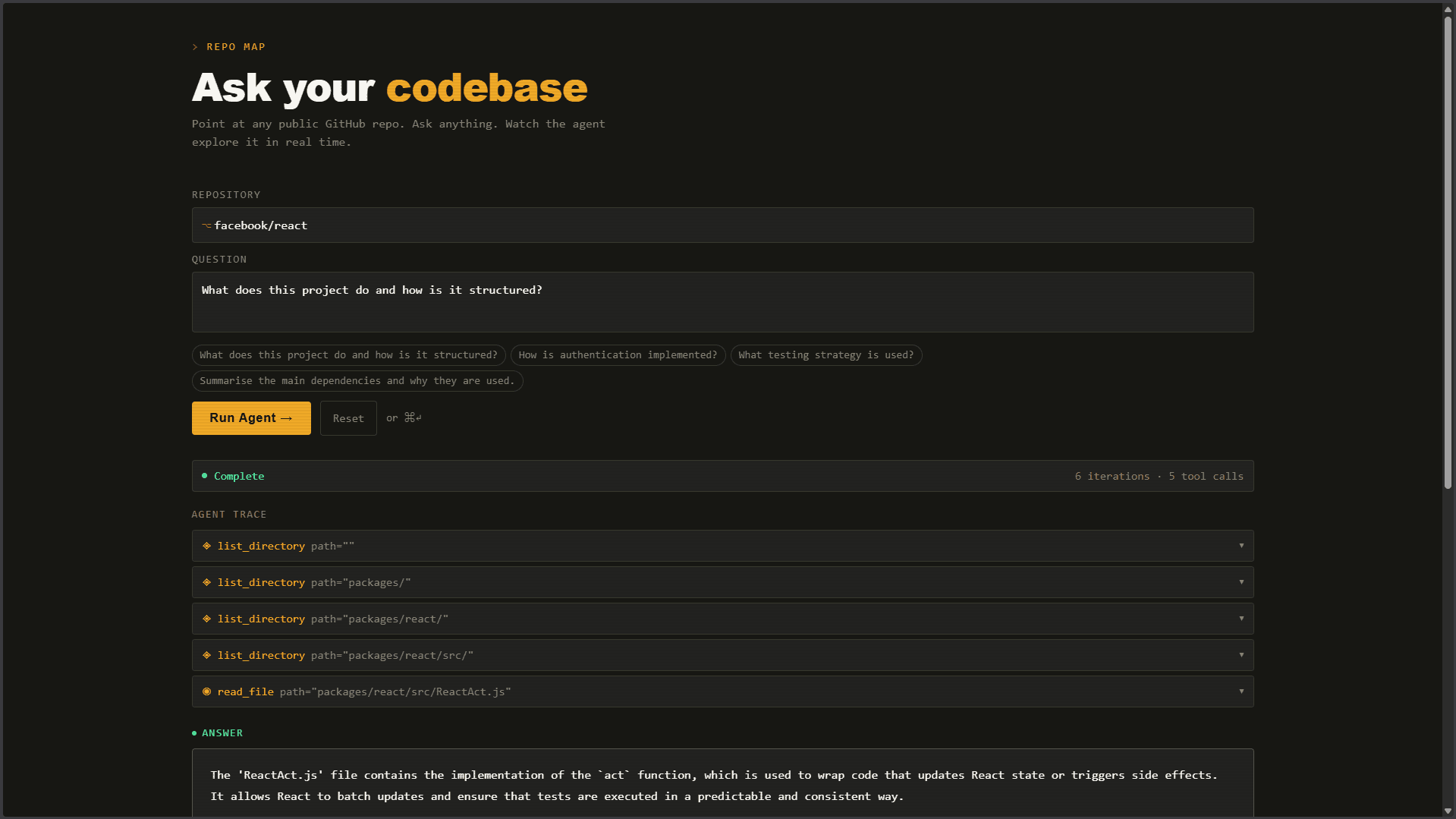 RepoMap is an AI-powered tool that allows users to ask questions about any public GitHub repository. Given a repository link and a query, the agent navigates the codebase using tools such as directory listing and file reading to find relevant information and generate an answer. It also provides a live trace of its reasoning process, showing which tools it uses and what data it inspects.... Read more